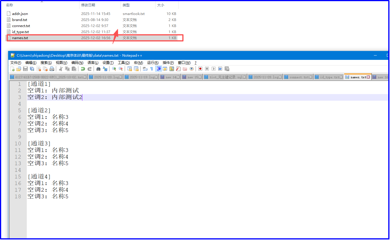软件支持修改通道内空调显示名称,修改data/name.txt文件,根据实际场景修改对应空调名称。